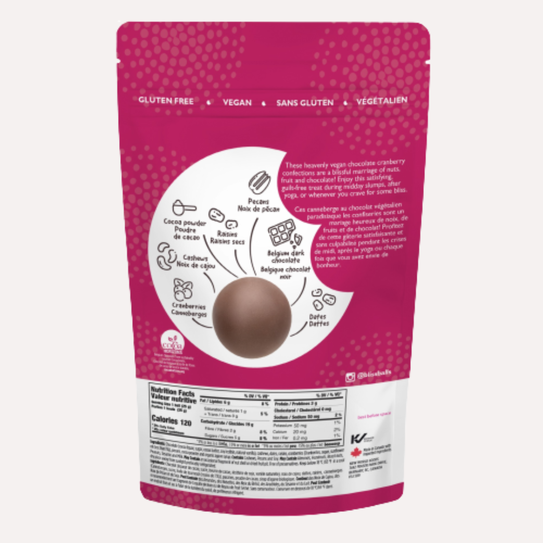 Chocolate (unsweetened chocolate, cocoa liquor, sugar, cocoa butter, soy lecithin, natural vanilla), Dates, Cashews, Thompson raisins, organic Cranberries {cranberries, sugar, organic sunflower oil (less than 1%)}, Cocoa powder, Pecans and organic Agave syrup. Contains Cashews, Pecans and Soy.